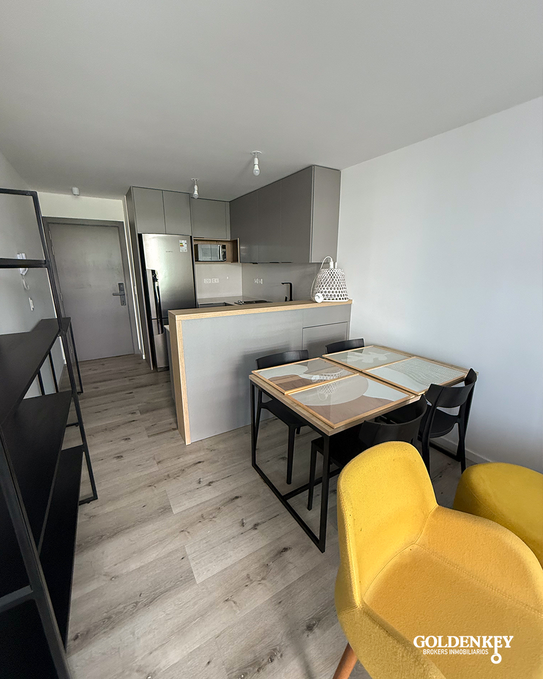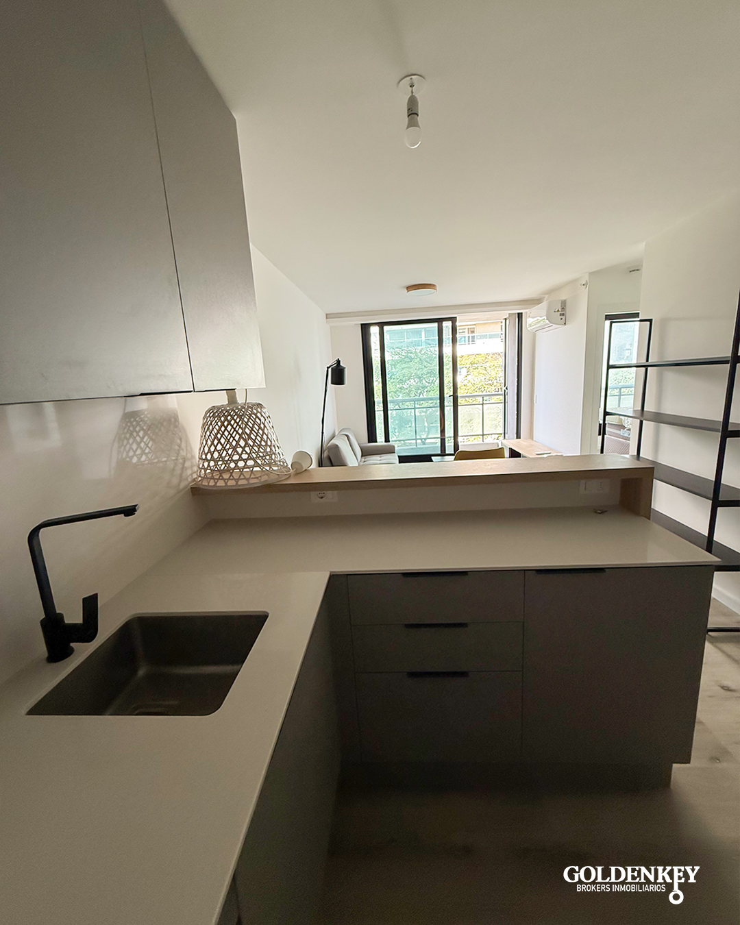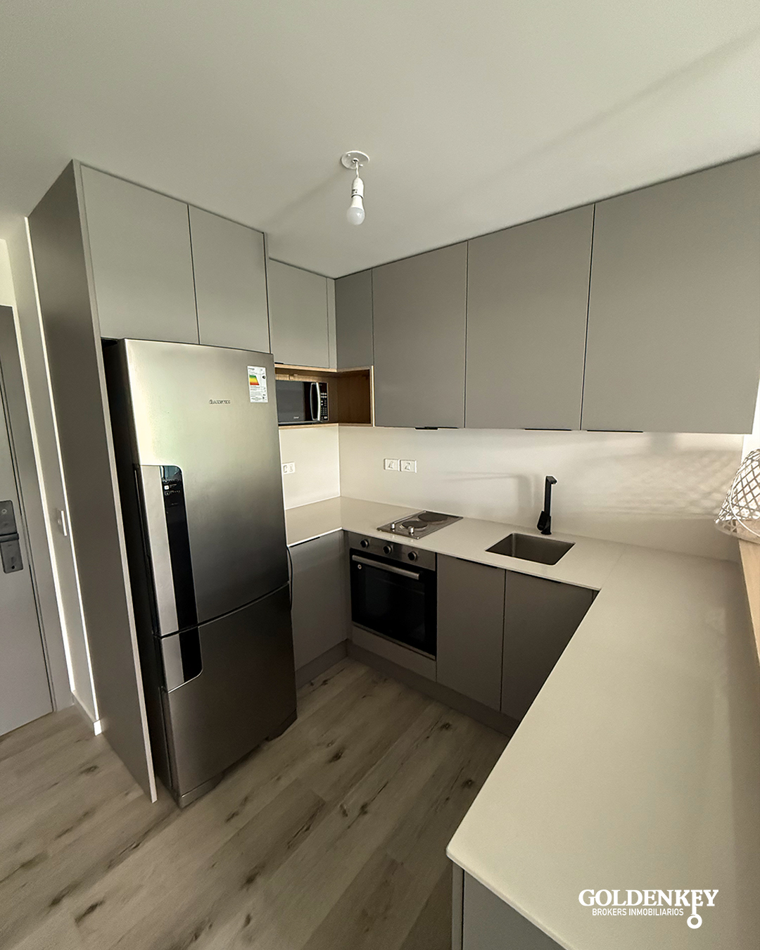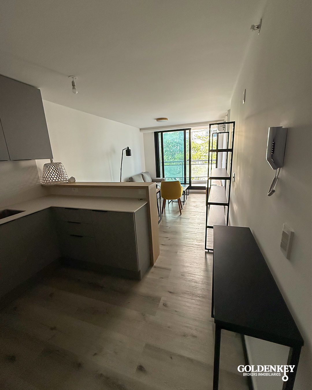 Ingreso a Living comedor con cocina integrada y salida a terraza. Cocina integrada con horno, anafe, heladera y microondas.