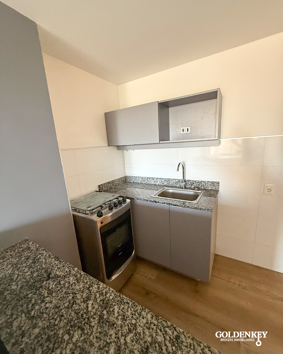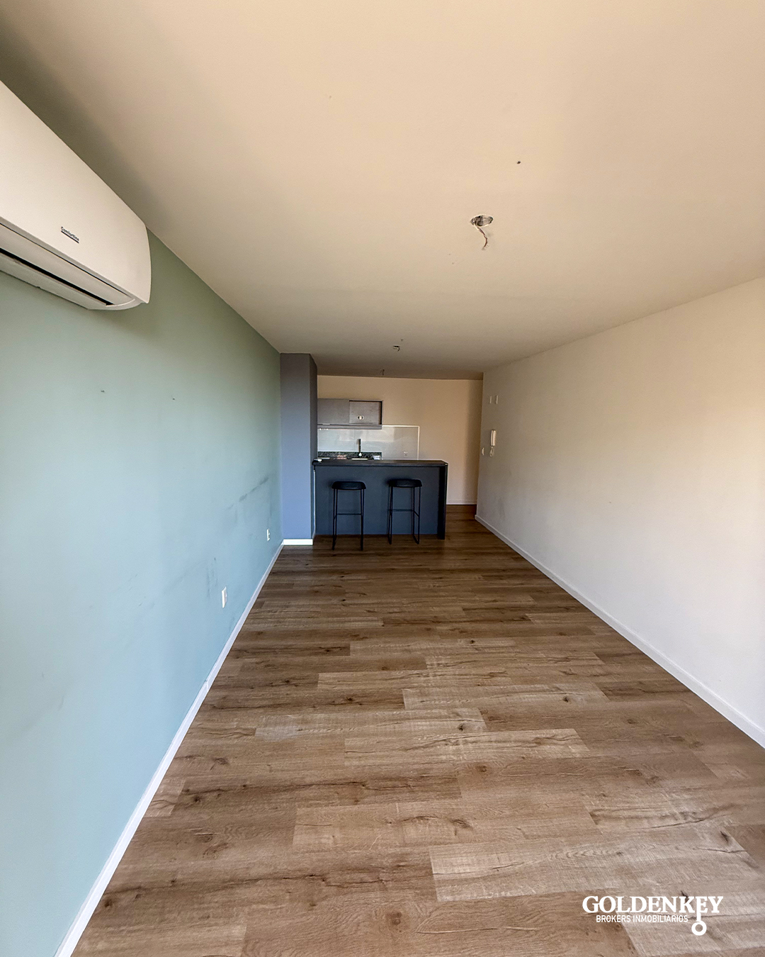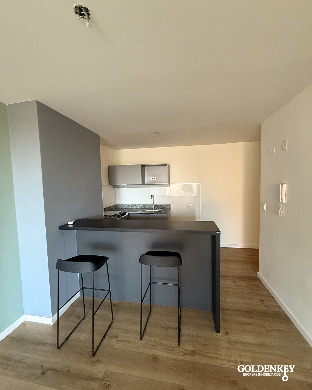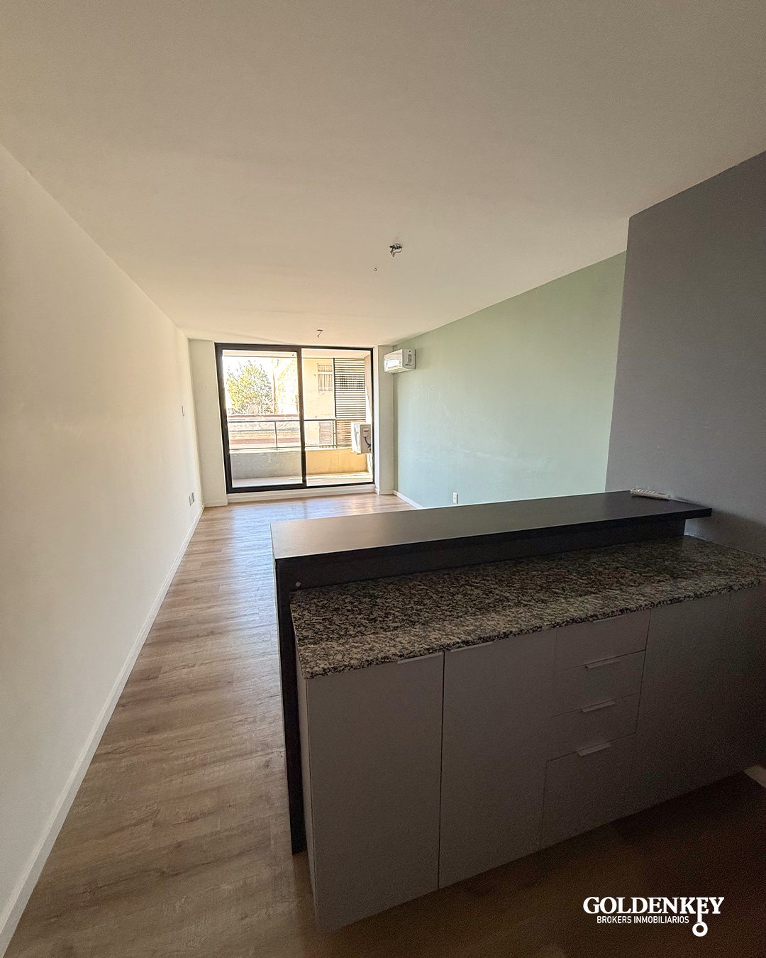 Ingreso al Apartamento a amplio Living comedor con cocina integrada. Barra pasaplatos en granito. Muebles en MDF bajo mesada y aéreo. Piso vinílico.