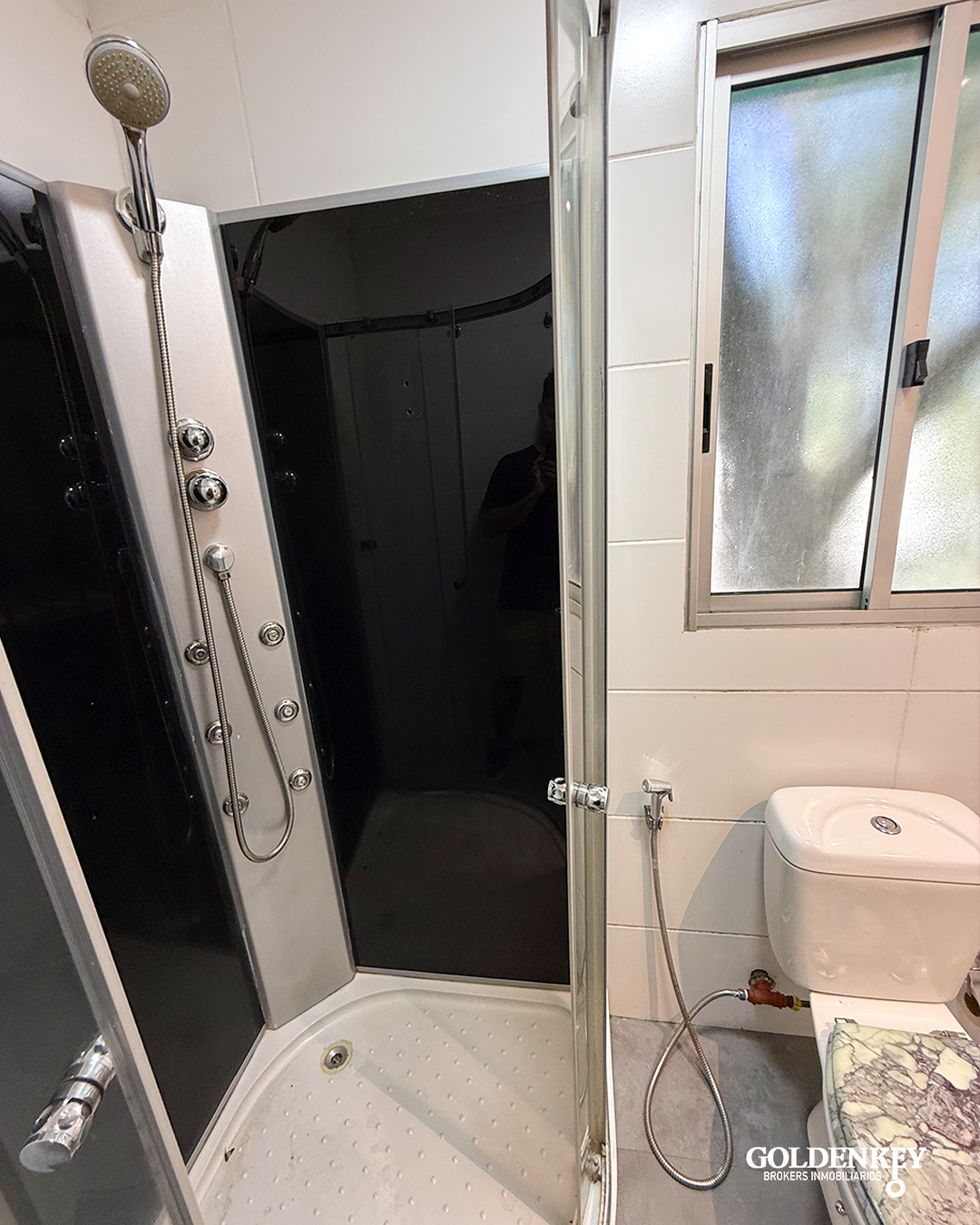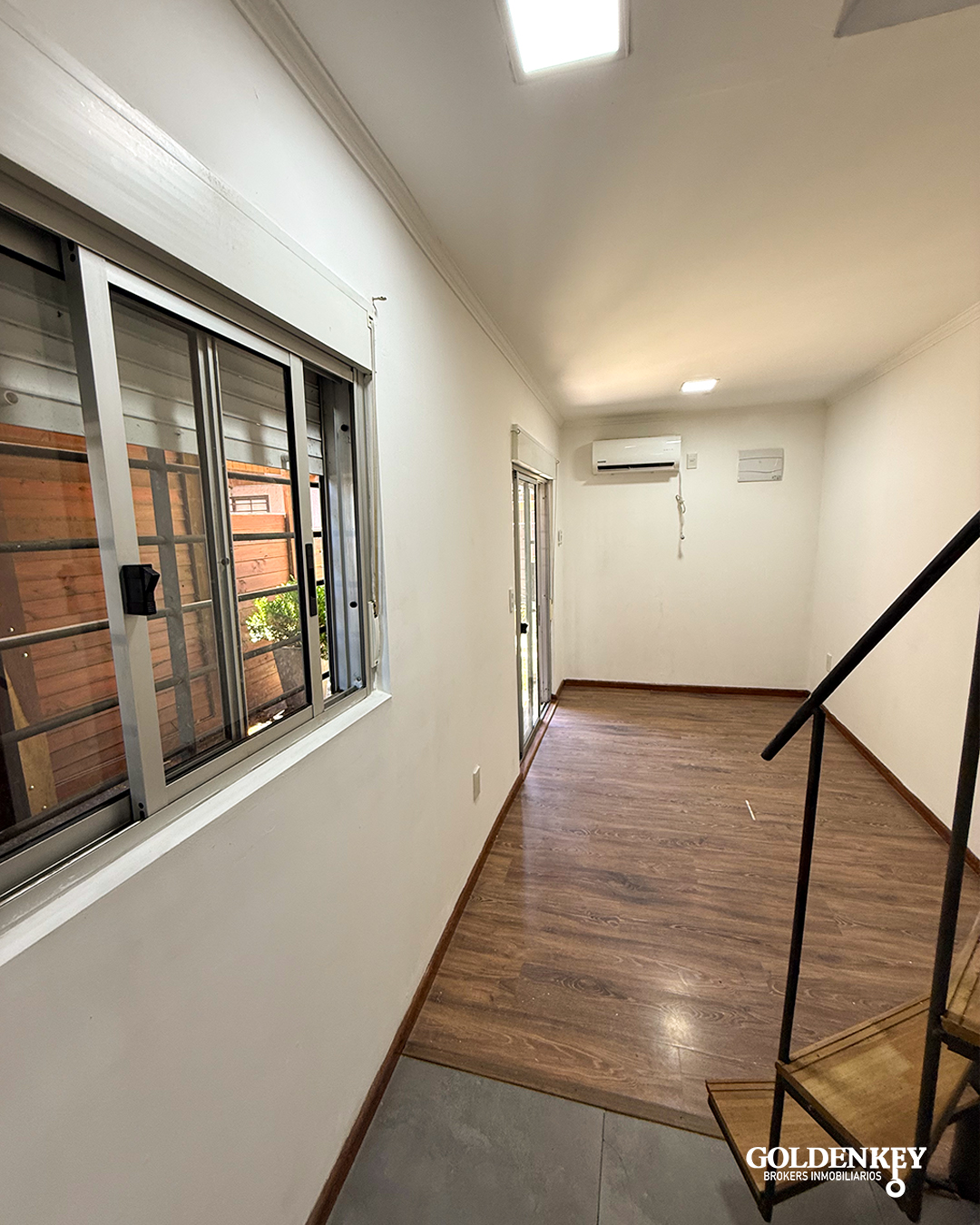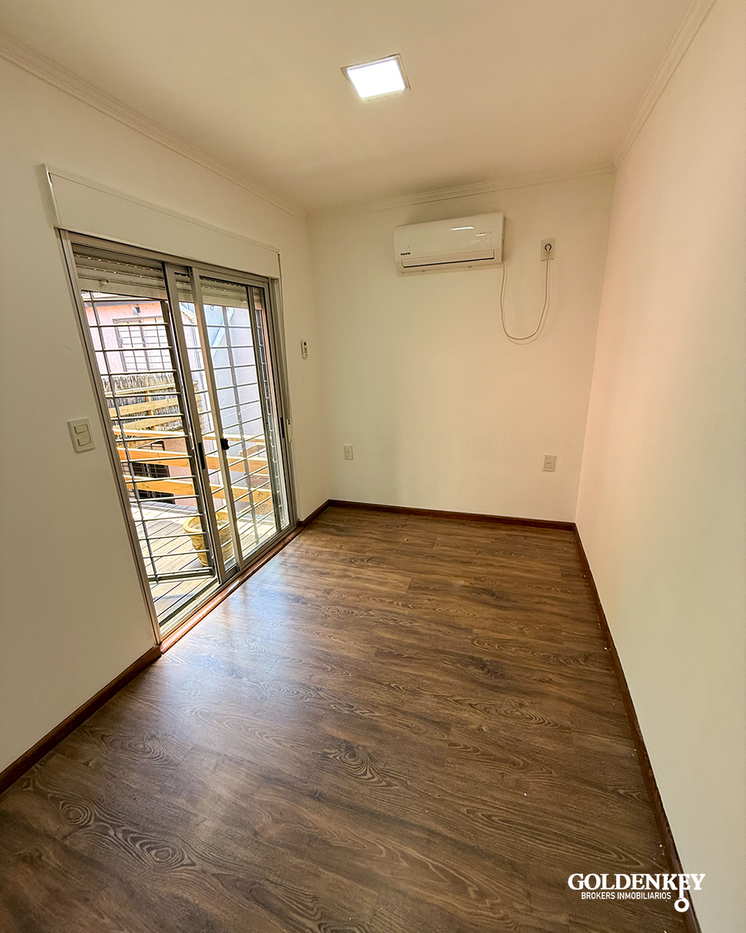 Ingreso por puerta ventana en aluminio con rejas a living comedor amplio y luminoso con aire acondicionado.