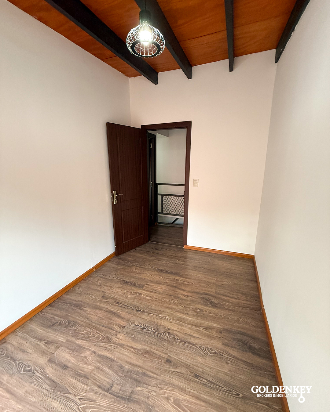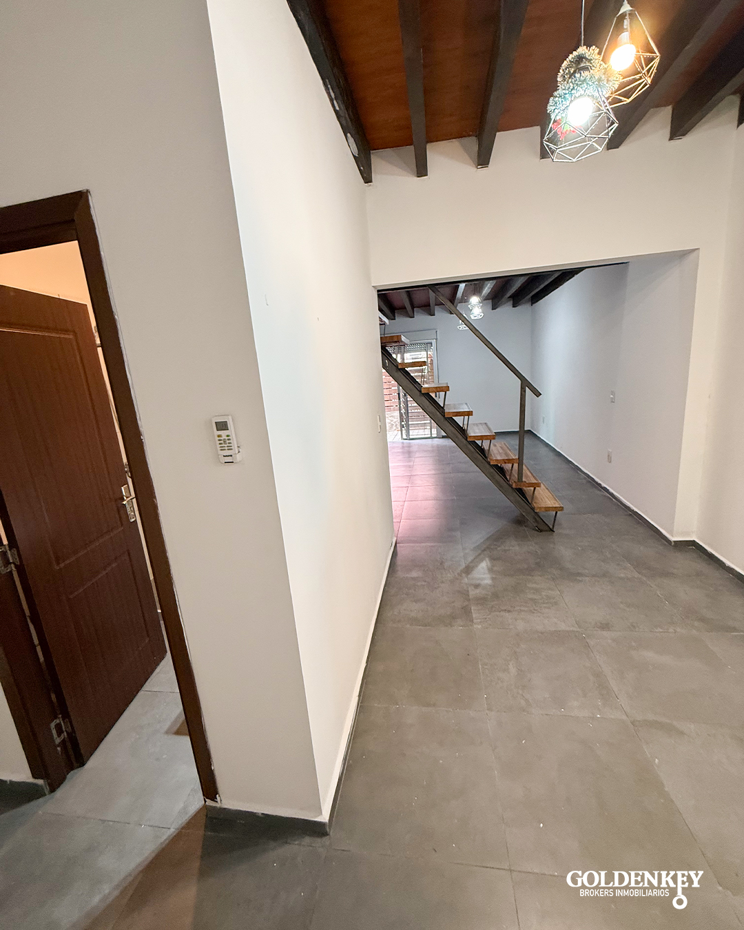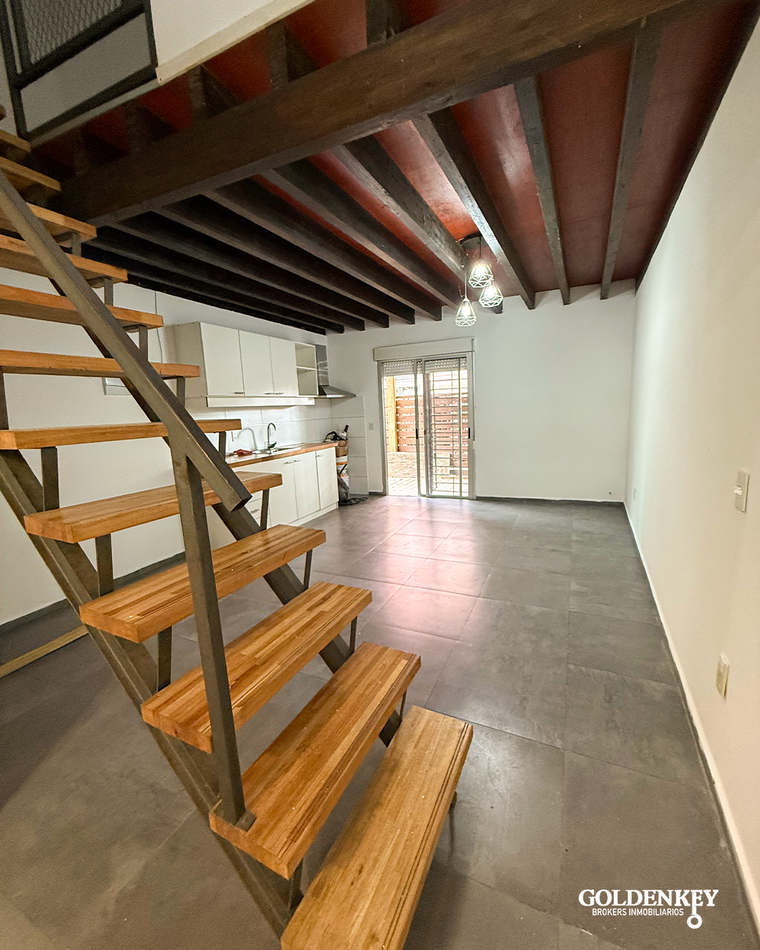 Escalera en madera para acceso a segundo piso.