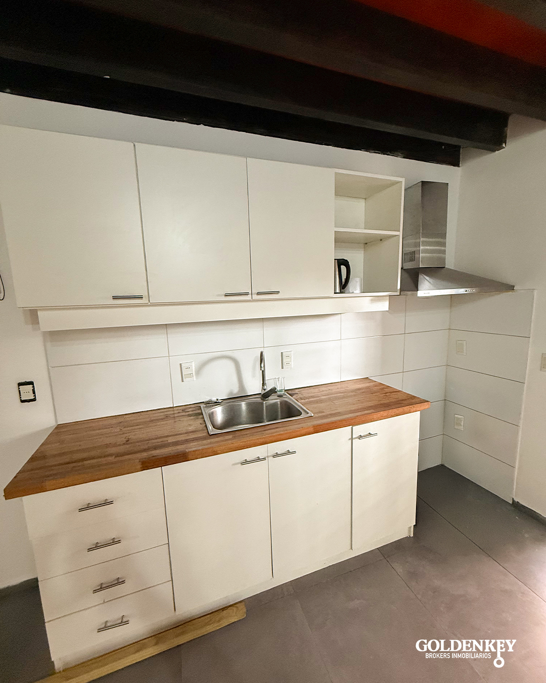 Cocina integrada con muebles aéreos y bajo mesada en MDF. Cuenta con extractor.