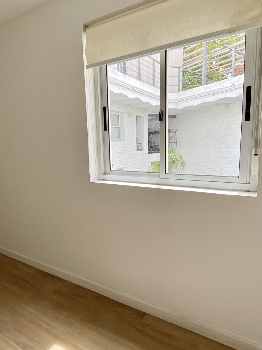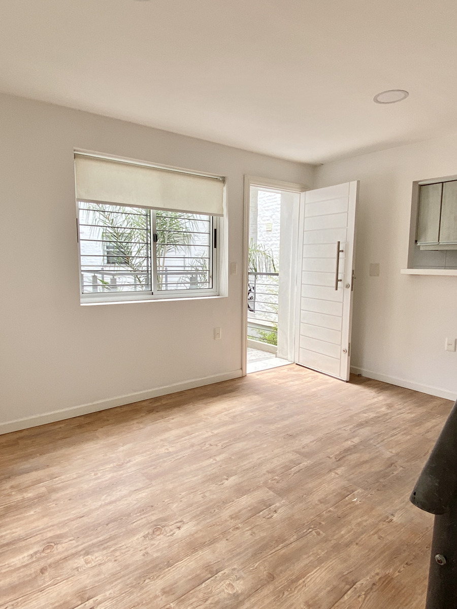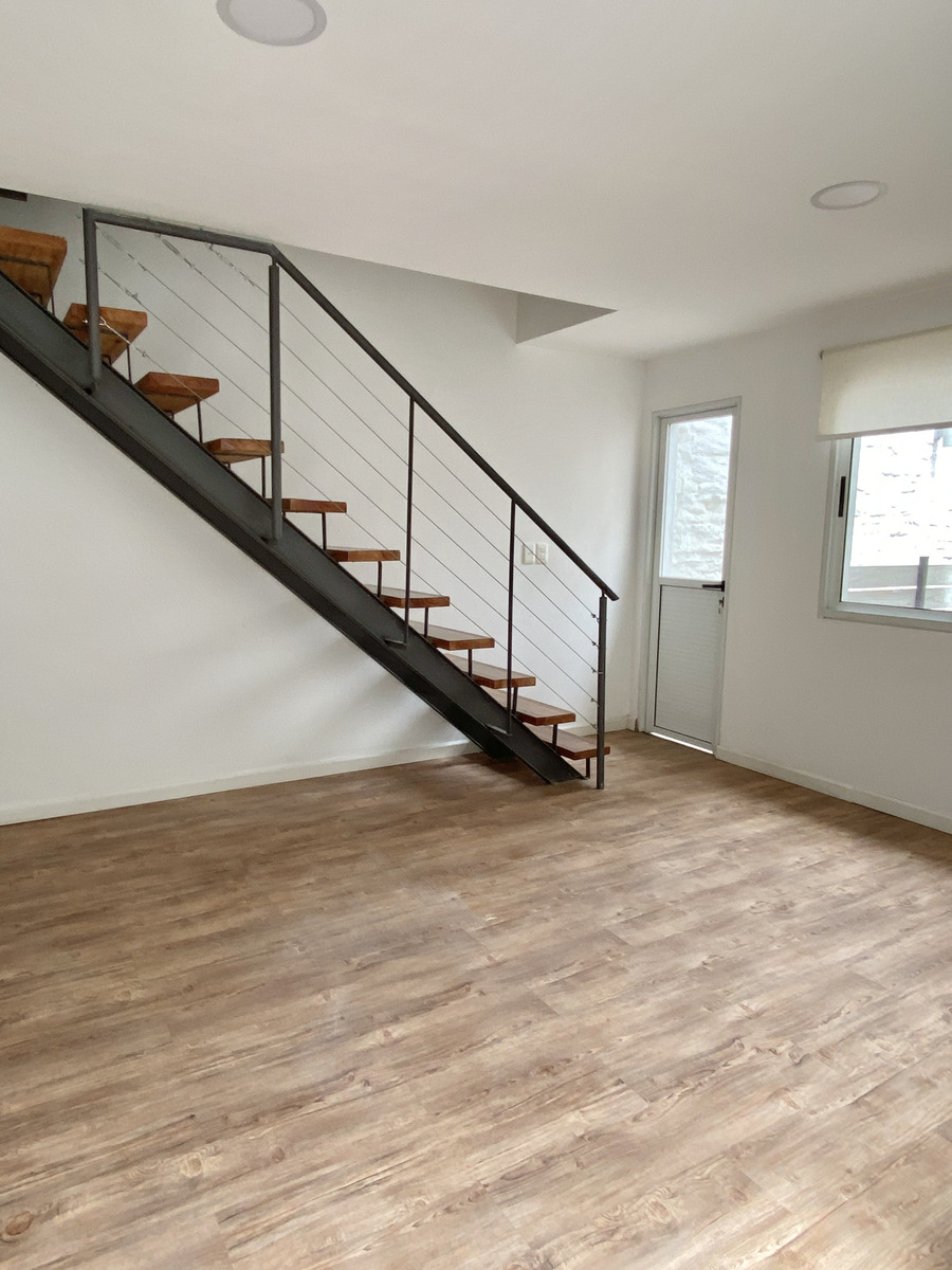 El apartamento es tipo dúplex, con living comedor, cocina definida y acceso a patio en planta baja. En planta alta se distribuyen dos dormitorios y un baño completo.