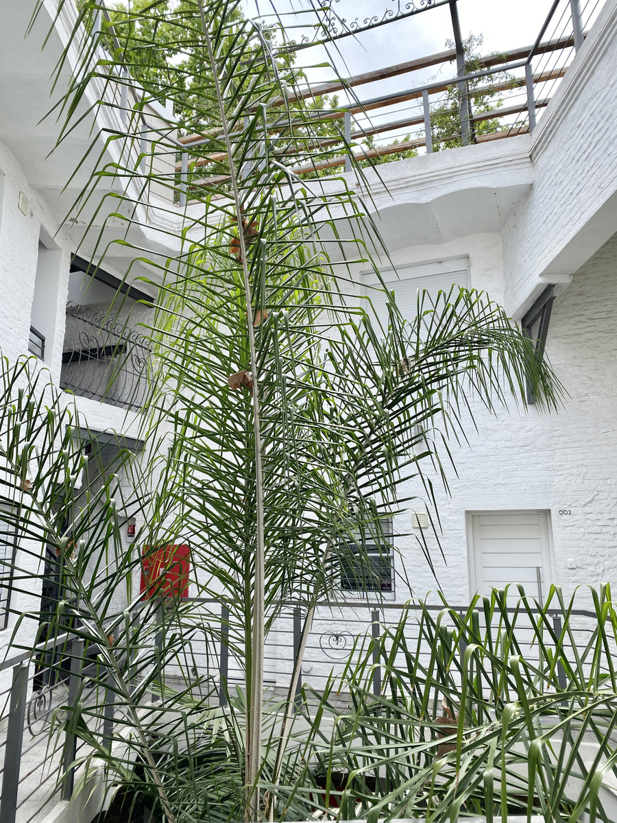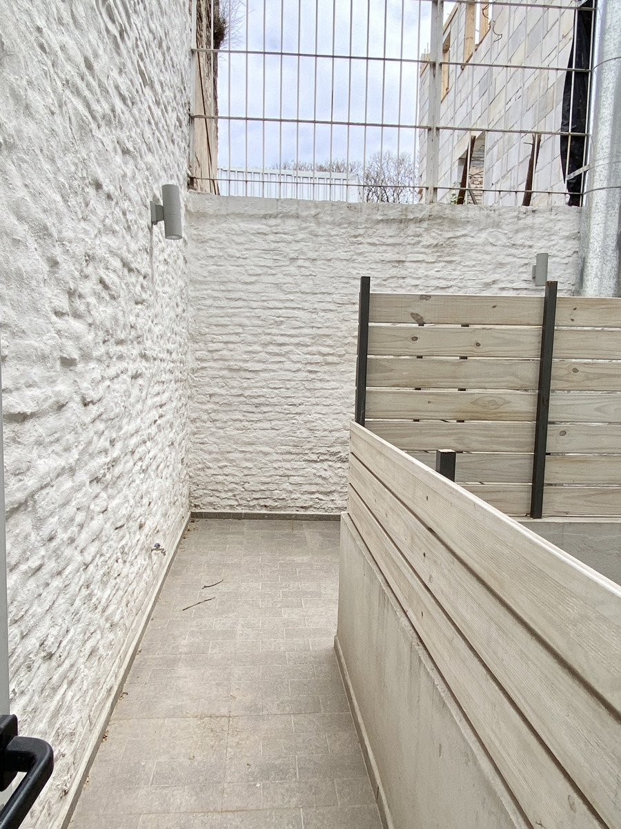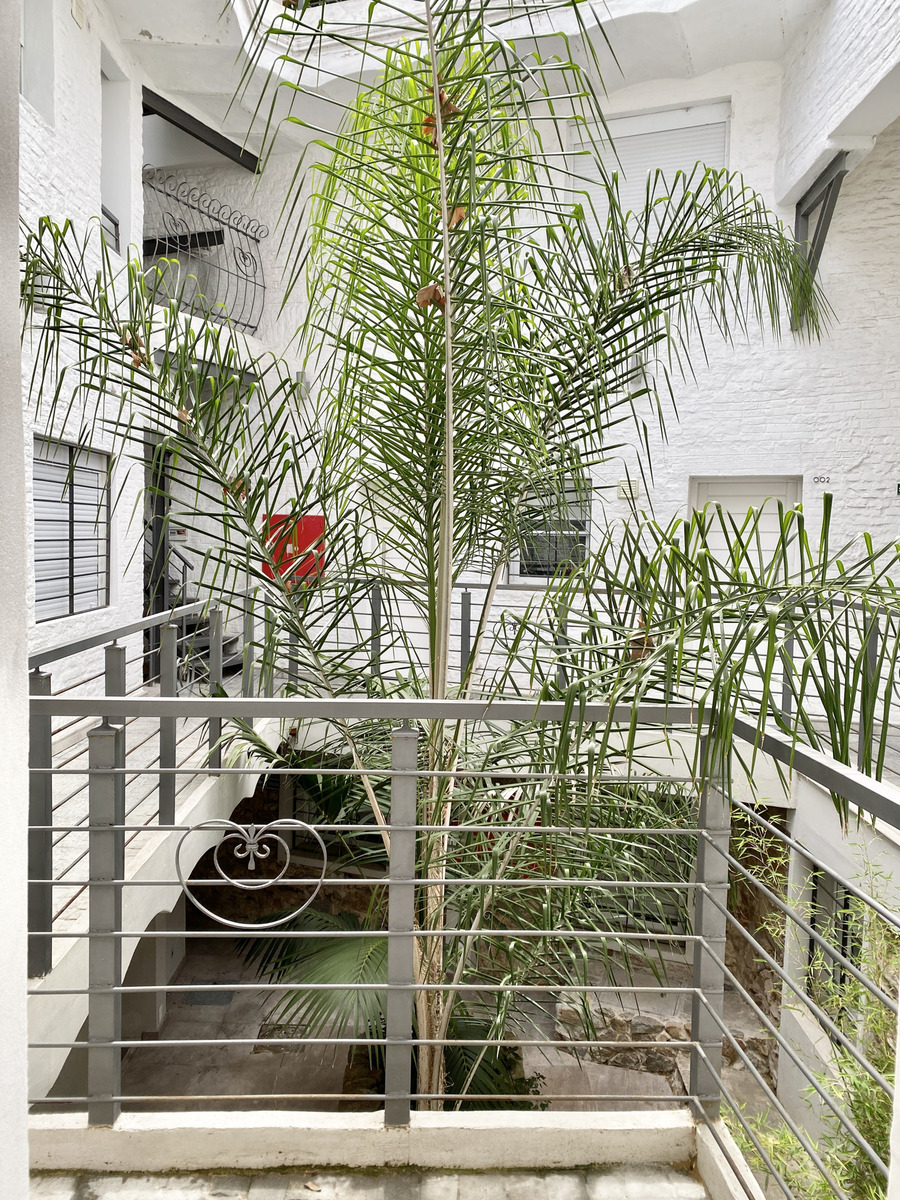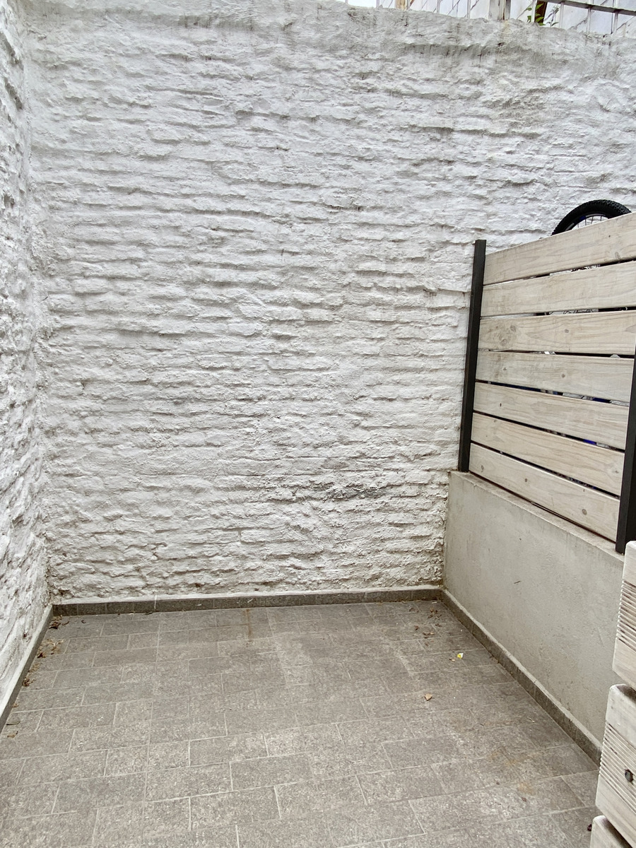 El apartamento es tipo dúplex, con living comedor, cocina definida y acceso a patio en planta baja. En planta alta se distribuyen dos dormitorios y un baño completo.