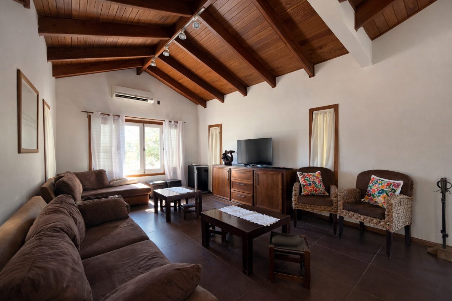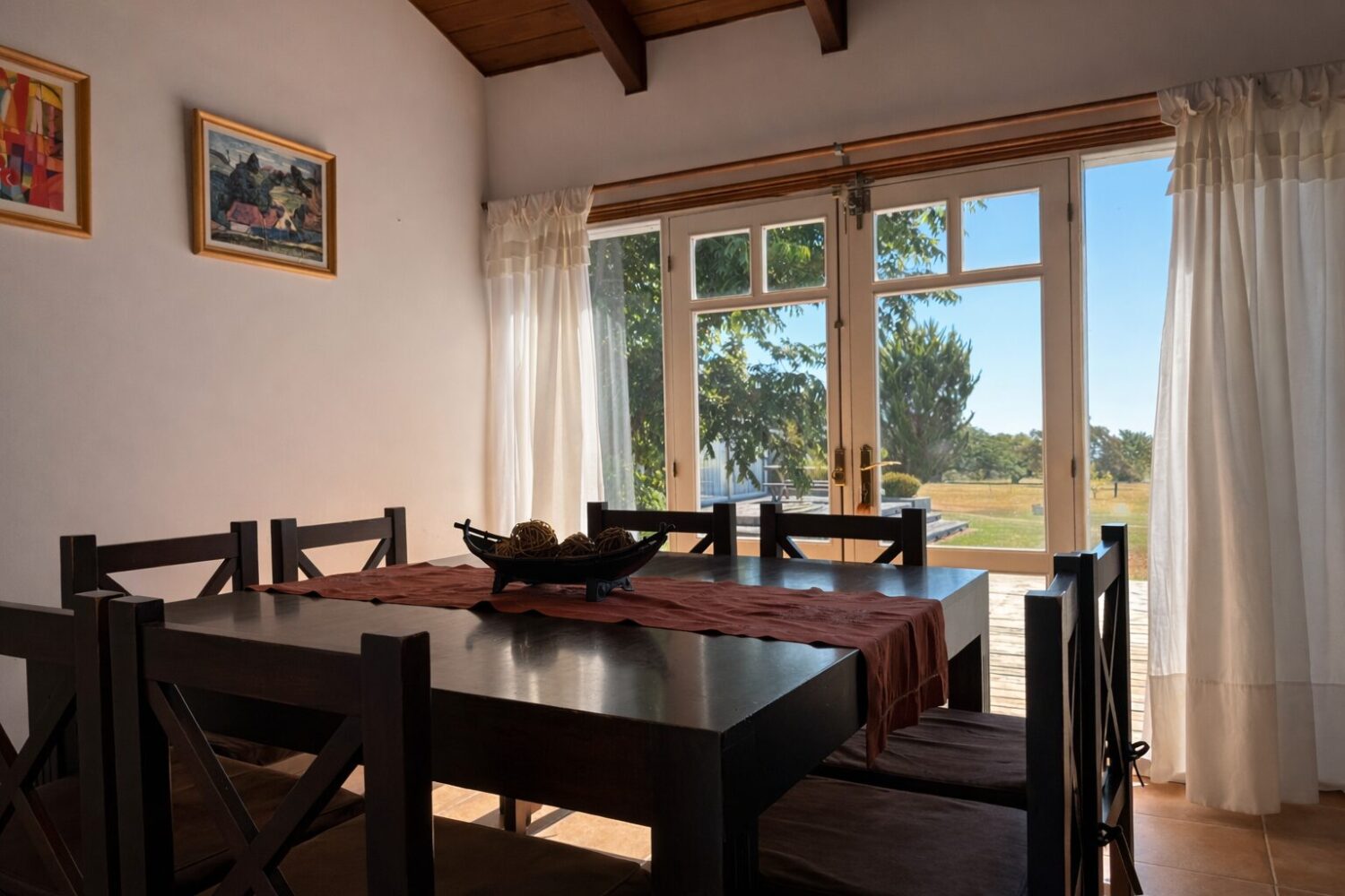 Con 185 metros cuadrados de construcción en sistema Wood Framing, la casa combina la calidez natural de la madera con un nivel de terminaciones que se percibe en cada detalle. Techos con vigas de madera a la vista, pisos de madera maciza, carpinterías de calidad y amplitudes generosas definen el carácter de cada ambiente.