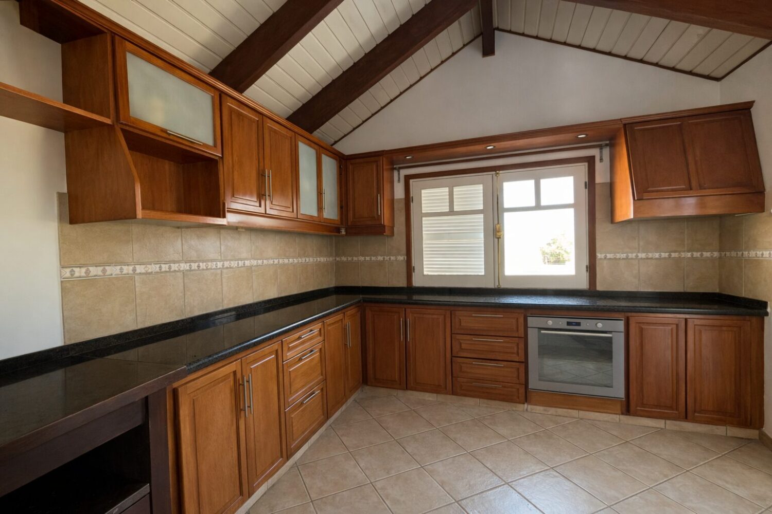 La planta cuenta con cuatro dormitorios, living-comedor con acceso directo al parque, cocina independiente con muebles de madera maciza y mesada de granito negro, y múltiples baños completos.