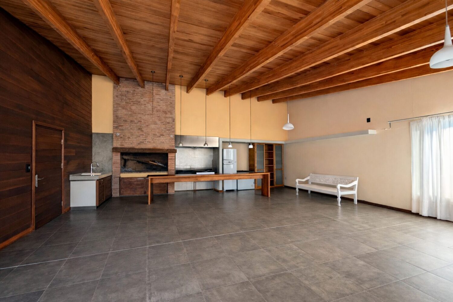 El parrillero de 80 metros cuadrados, con techo de vigas de madera y parrilla a leña, es uno de los puntos más destacados de la propiedad. Su escala lo convierte en un espacio para recibir que supera ampliamente lo habitual.