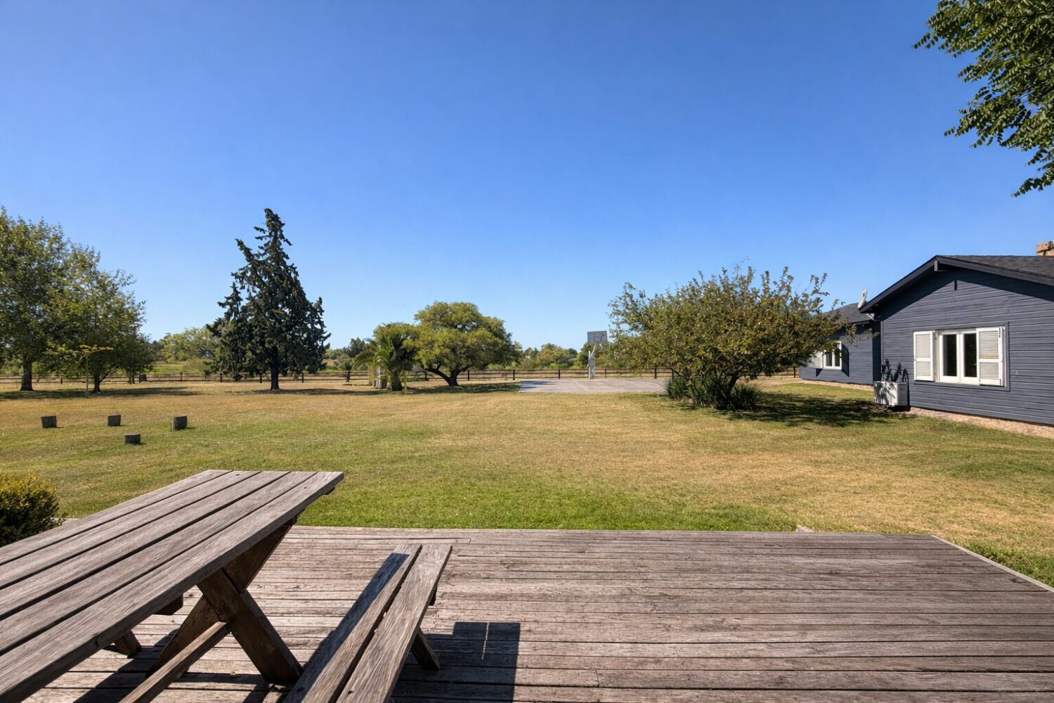 El parque de aproximadamente 4.000 metros cuadrados, completamente parquizado, incluye fogón, cancha de básquet, árboles maduros y horizonte abierto. El garaje cerrado tiene capacidad para dos vehículos, con espacio adicional al aire libre.