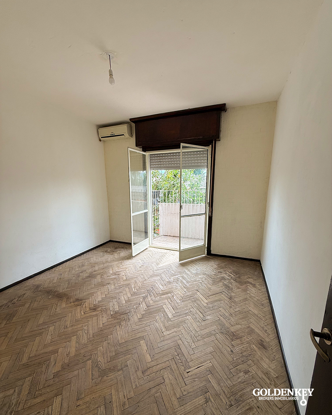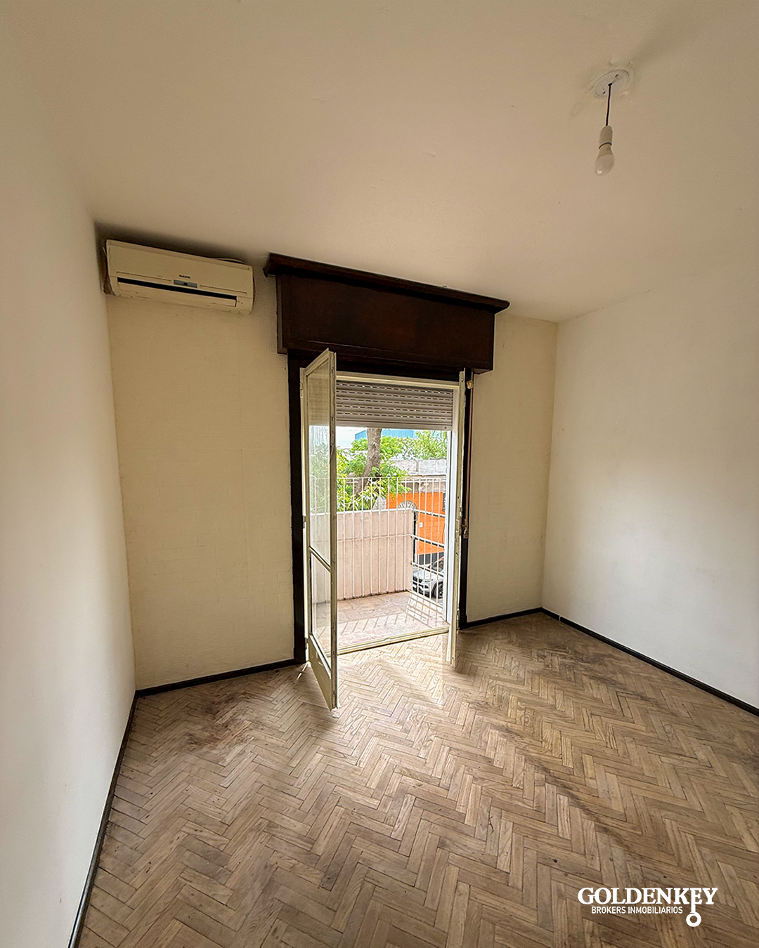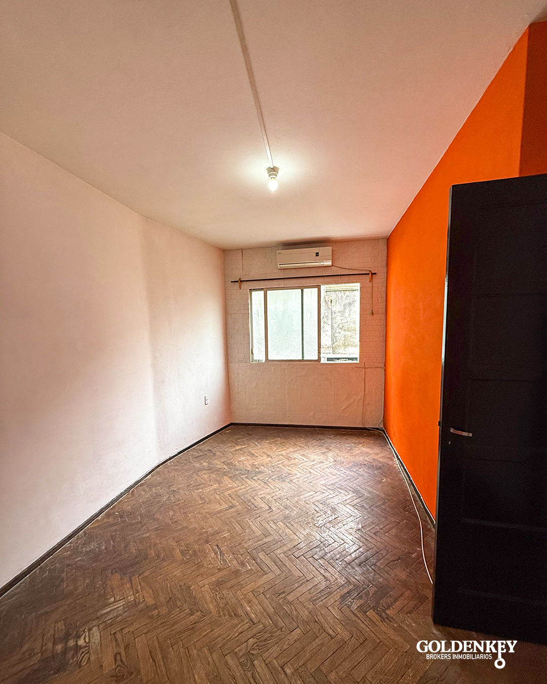 Ingreso al apartamento a living comedor de 5.3 x 3 m con ventana en aluminio con aire acondicionado con piso parquet.